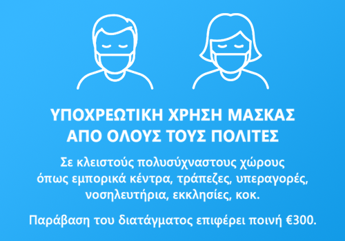Στα πλαίσια αντιμετώπισης της εξάπλωσης του Κορωνοïού έχει καταστεί υποχρεωτική η χρήση μάσκας από όλους τους πολίτες, σε κλειστούς πολυσύχναστους χώρους.